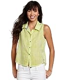 Woven sleeveless button up tank with collar, contrast black and white stripe at interior neck binding, slight shirttail at back hem, stone embroidery at front left